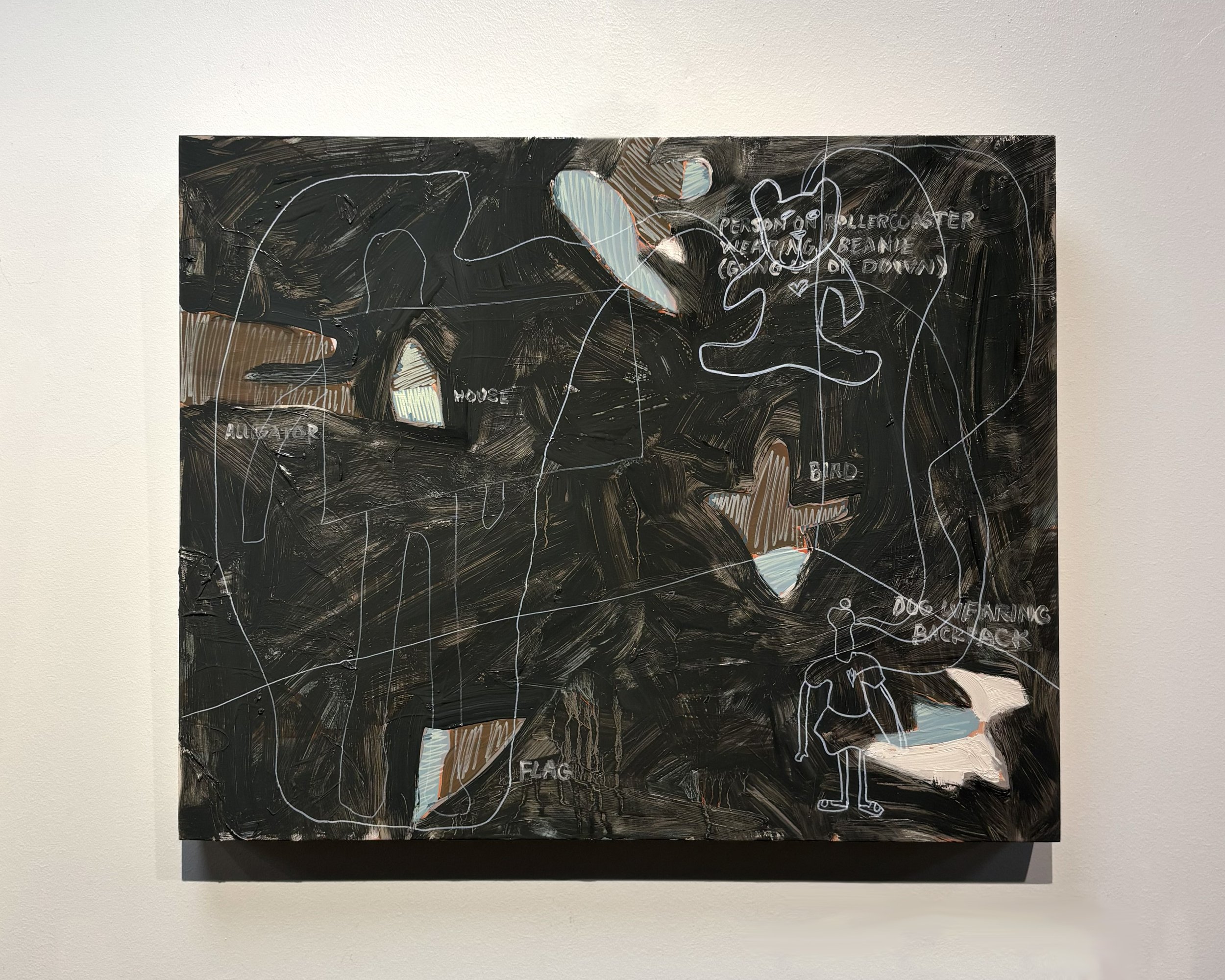 Dog Wearing Backpack. 18 in x 24 in. Oil and fabric on canvas. 2025.